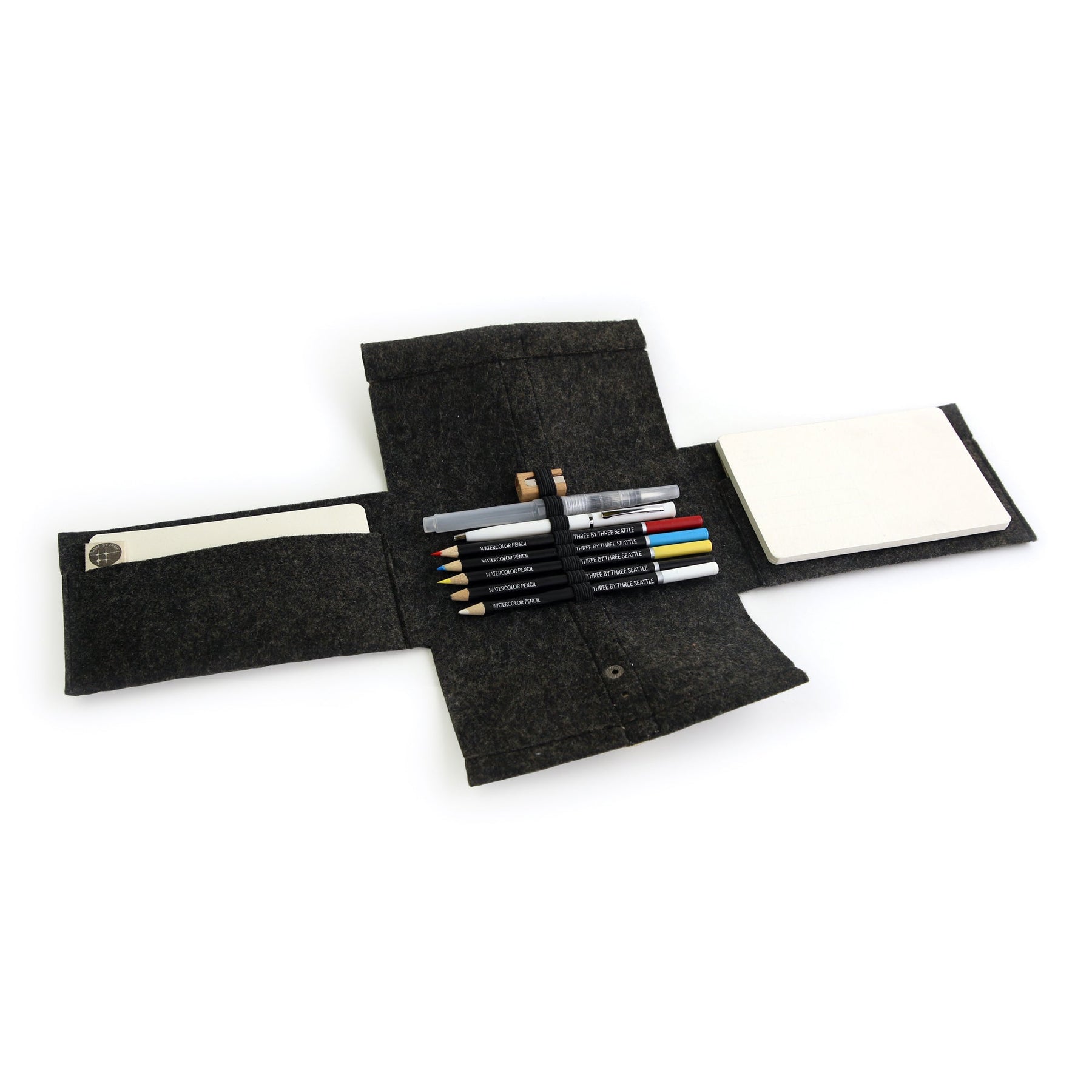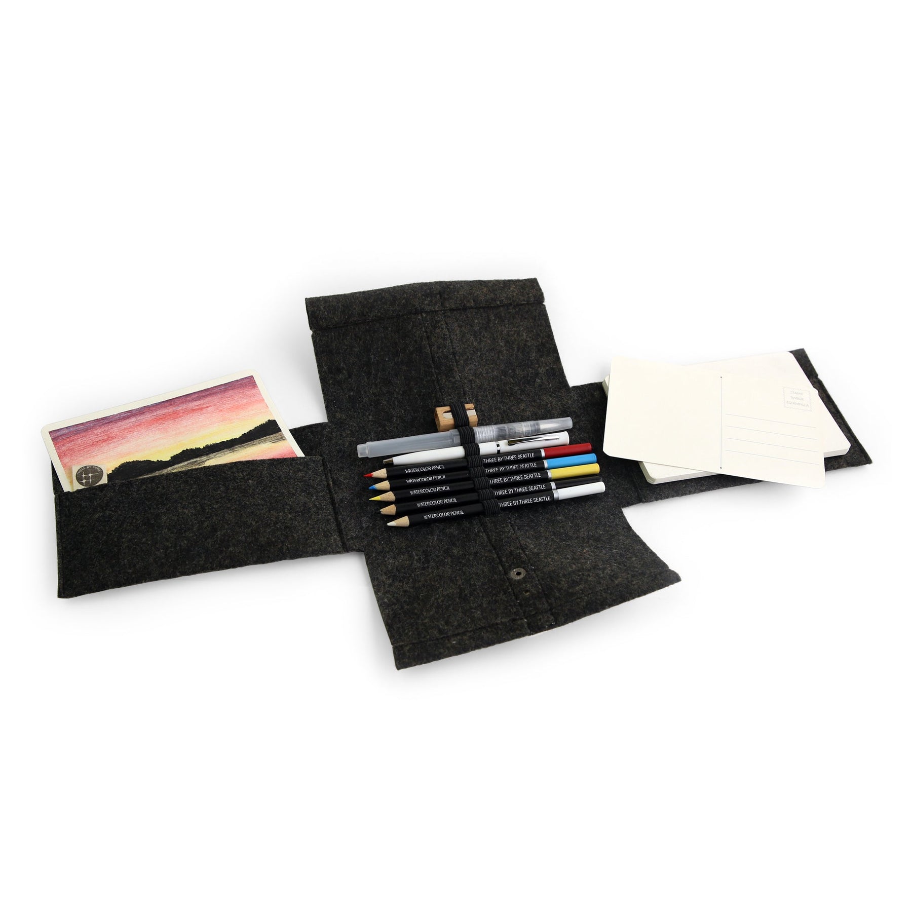 Post your adventures old-school style with our watercolor pencil travel postcard sets. These portable studios, with a 100% recycled case, include everything needed to create a mini masterpiece or sketch out a memory to send to friends and loved ones. Watercolor pencils can be used dry as colored pencils, or with water as watercolor paints. A metal snap closure wraps around a multi-fold charcoal felt pouch to contain contents securely; toss into your backpack and spread out on a mountaintop or lakeside, or while sipping rosé at a Parisian café... wherever inspiration strikes! Travel postcard set also available with watercolor paint. Designed by Gwen Weinberg.